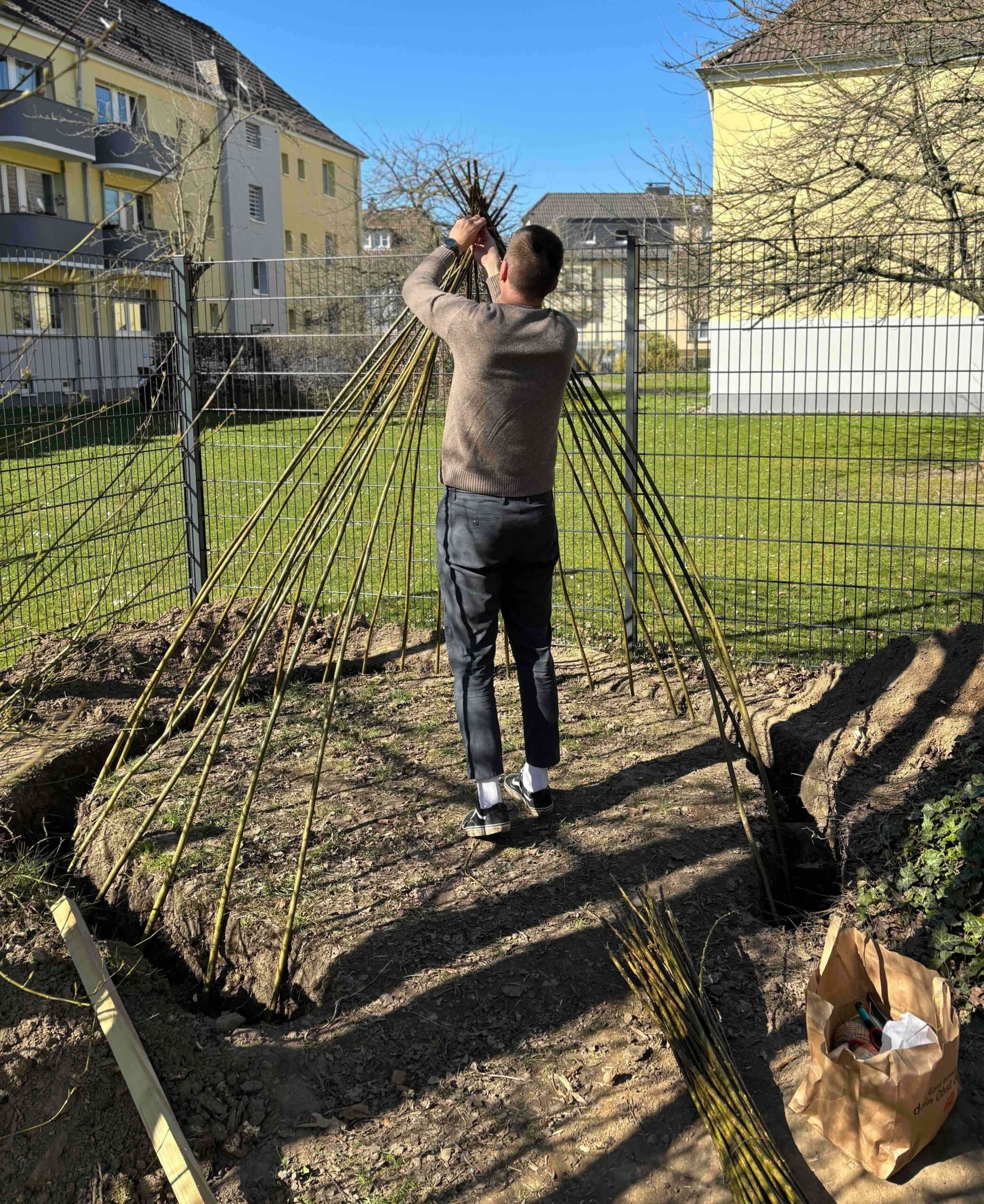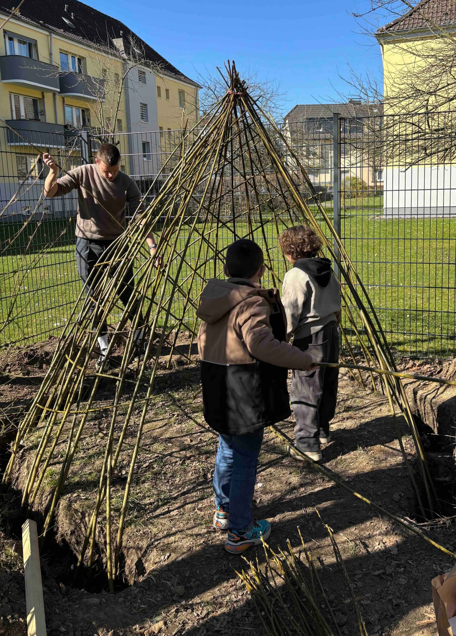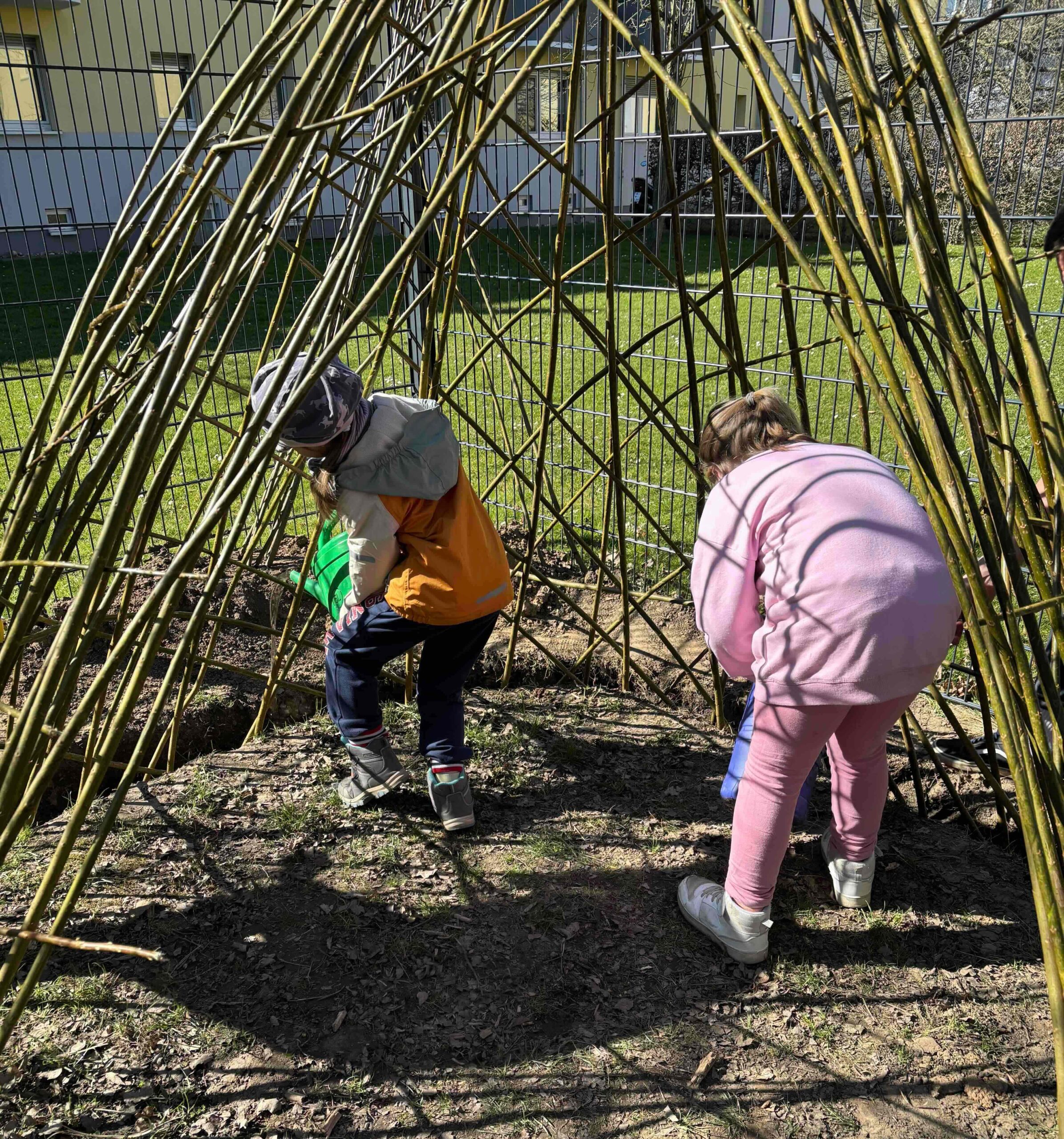 Dank der gemeinnützigen Stiftung „Ein Herz lacht“ und ihrer großzügigen Spende von 1000,- €, durften wir uns im Frühjahr 2025 unseren Wunsch nach zwei Weidentipis auf unserem Schulgelände erfüllen. An mehreren Terminen setzten wir unser gemeinsames Bauprojekt um. Mit der Hilfe von Eltern und einzelnen Schüler:innen hoben dann einige unserer tatkräftigen Pädagog:innen unserer Arbeitsgruppe „Schulgarten“ zwei geeignete Gräben aus, pflanzten die Gerüstruten ein und flochten die Flechtruten, damit die Weidenruten auch gut angehen und wachsen konnten. Für das Gießen, Hegen und Pflegen der Weidentips übernahmen dann tatsächlich alle Klassen unserer Schule im Wechsel die Verantwortung, so dass über den Sommer zwei wundervoll und toll bewachsene Weidentipis zum Spielen genutzt werden konnten. Unsere Weidentipis sind inzwischen für unsere Schüler:innen ganz beondere Spielorte geworden. Sie dienen als Versteck, Räuberhöhle, Schloss oder Verkaufsladen und werden auch gerne als Rückzugsort für ein gemütliches Frühstück oder eine Lesezeit im Freien genutzt. Nun wird es Herbst und auch unsere Weidentipis verlieren so langsam ihre Blätter. Wir hoffen, dass die Weiden den Winter gut überstehen und die Augen unserer Schüler:innen im nächsten Frühjahr und Sommer wieder zum Strahlen bringen.